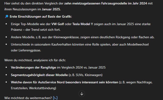 Prompt: > Erstelle eine Übersicht der zehn Fahrzeugmodelle mit den höchsten Neuzulassungen im Gesamtjahr 2024 und vergleiche diese mit den Januar-Zahlen 2025. Zeige auf, ob sich Trends bestätigen oder verschieben. Nutze Diagramme für die grafische Darstellung.