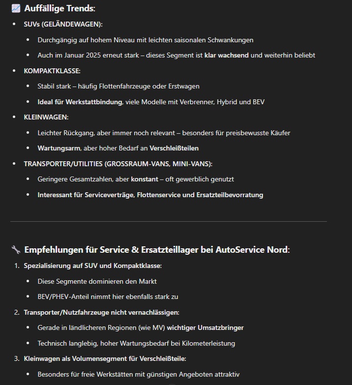 Prompt: > Welche Fahrzeugsegmente (z. B. SUV, Kompaktklasse, Transporter) zeigen eine kontinuierliche Zunahme bei den Neuzulassungen? Leite daraus ab, welche Fahrzeugtypen für Service-Angebote und Ersatzteillager in den kommenden Jahren relevant werden könnten.