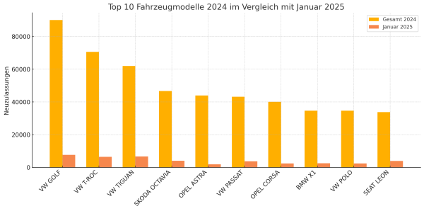 Prompt: > Erstelle eine Übersicht der zehn Fahrzeugmodelle mit den höchsten Neuzulassungen im Gesamtjahr 2024 und vergleiche diese mit den Januar-Zahlen 2025. Zeige auf, ob sich Trends bestätigen oder verschieben. Nutze Diagramme für die grafische Darstellung.