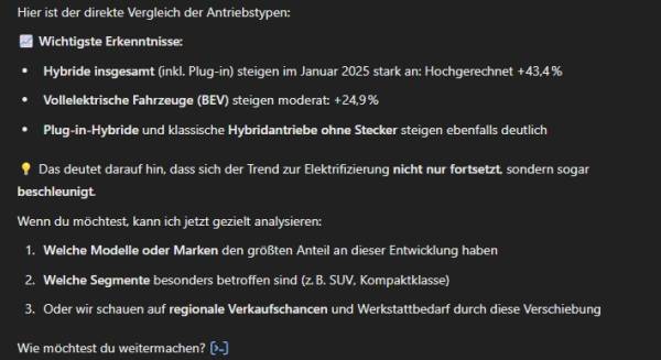 Prompt: > Welche Marken haben im Betrachtungszeitraum (2024 + Jan 2025) durchgehend hohe Zulassungszahlen bei alternativen Antrieben (BEV/Hybrid)? Zeige auf, ob eine Spezialisierung der Werkstatt auf diese Marken sinnvoll wäre (z. B. VW, Tesla, Hyundai, etc.).
