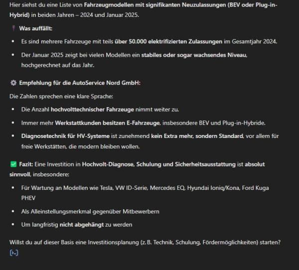 Prompt: > Finde alle Modelle, die sowohl 2024 als auch im Januar 2025 signifikant (>1.000 Zulassungen) mit BEV oder Plug-in-Hybrid ausgestattet waren. Liste diese auf und gib Empfehlungen, ob sich eine Investition in Hochvolt-Diagnosetechnik für Werkstätten lohnt.