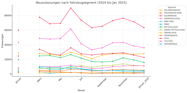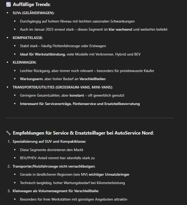 Prompt: > Welche Fahrzeugsegmente (z. B. SUV, Kompaktklasse, Transporter) zeigen eine kontinuierliche Zunahme bei den Neuzulassungen? Leite daraus ab, welche Fahrzeugtypen für Service-Angebote und Ersatzteillager in den kommenden Jahren relevant werden könnten.